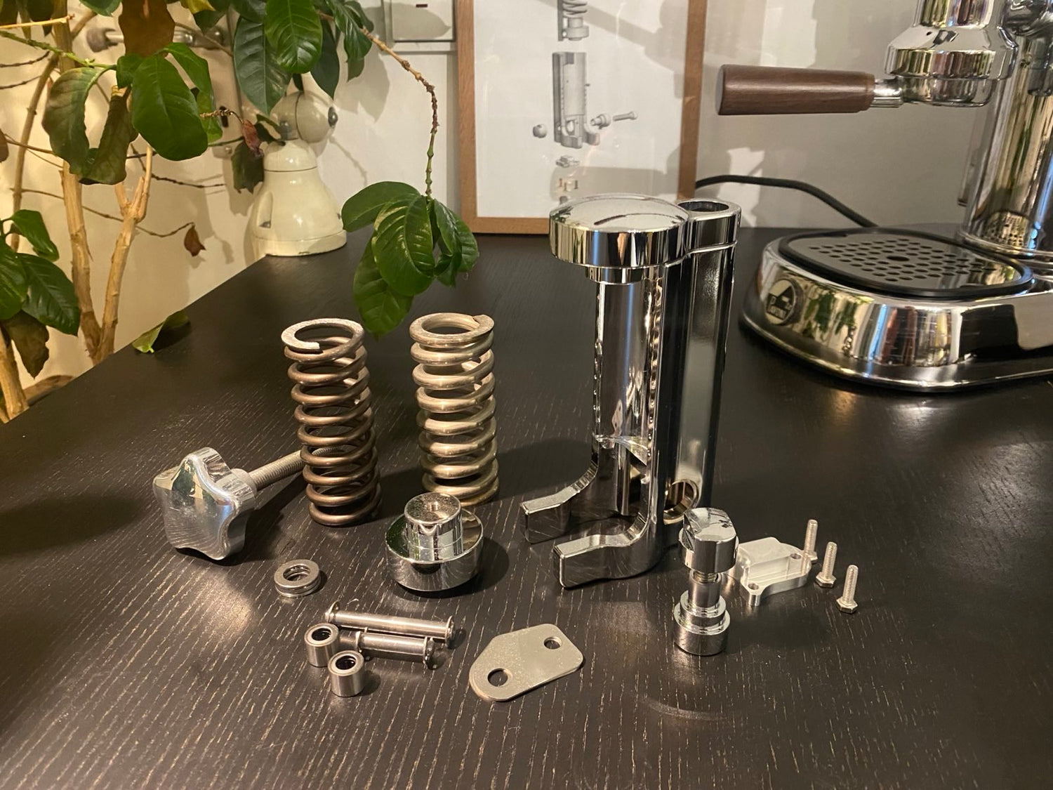 Die Rahmenteile sind aus verchromten 5-achs gefrästem Aluminium. Die austauschbaren Federn ermöglichen einen Maximaldruck von 6bar und 9 bar, abhängig von Mahlgrad und Puckvorbereitung. Der Federntausch ist leicht in der Zeit machbar die es dauert eine frische Portion Kaffee zu mahlen.